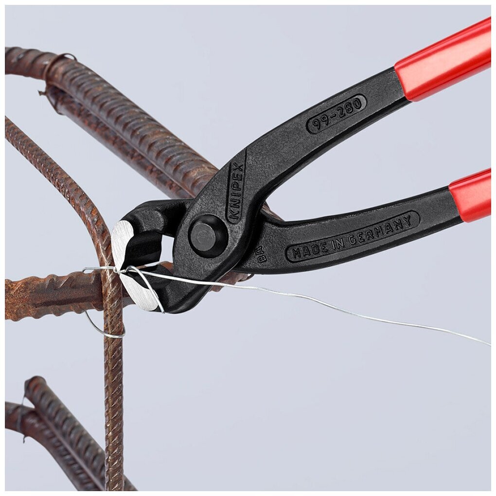 Вязальные клещи KNIPEX KN-9901280 предназначены для работы с проволокой и гвоздями, например, для связывания армирующего каркаса при бетонных работах. Данный инструмент имеет небольшой вес, всего 0.499 кг., что способствует меньшим энергозатратам оператора при больше производительности. При изготовлении вязальных клещей была использована специальная кованая инструментальная сталь, что увеличивает надежность и срок эксплуатации инструмента. Режущим кромкам клещей придана твердость 61 НRC для улучшения качества резания.