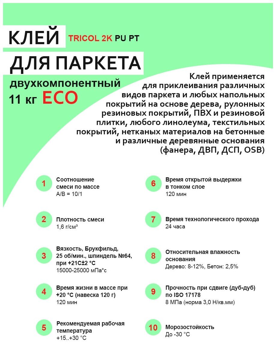 Двухкомпонентный полиуретановый клей для паркета TRICOL 2K PU PT ECO (Компоненты А и Б) 569 - универсальный полиуретановый клей обладает такими характеристиками, как: универсальность применения для многих типов покрытий, подходит для систем теплых полов, имеет возможность шлифовки паркета уже через сутки, высокая скорость отверждения после укладки, пониженный расход благодаря сравнительно низкой плотности, влагостойкий клеевой шов.