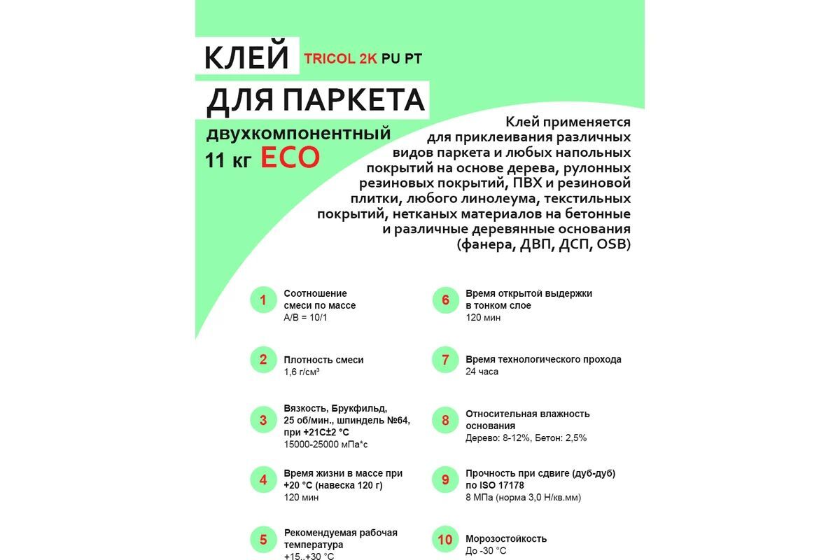 Двухкомпонентный полиуретановый клей для паркета TRICOL 2K PU PT ECO (Компоненты А и Б) 569 - универсальный полиуретановый клей обладает такими характеристиками, как: универсальность применения для многих типов покрытий, подходит для систем теплых полов, имеет возможность шлифовки паркета уже через сутки, высокая скорость отверждения после укладки, пониженный расход благодаря сравнительно низкой плотности, влагостойкий клеевой шов.
