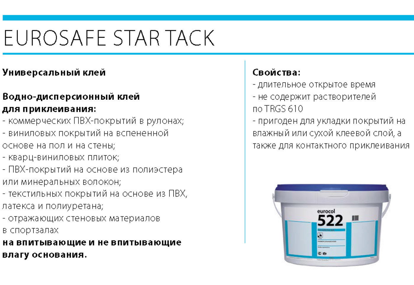 Forbo Eurocol 522 Eurosafe Star Tack — универсальный однокомпонентный клей на водной основе для приклеивания покрытий из ПВХ и вспененного винила. Подходит для полов и стен. 1