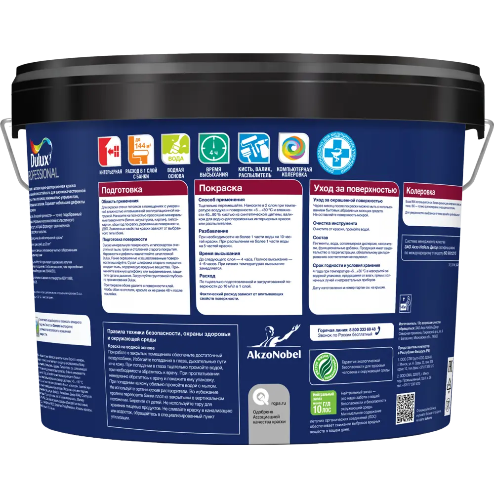 Краска для стен и потолков Dulux Professional Diamond - матовый водно-дисперсионный состав повышенной износостойкости для высококачественной отделки стен и потолков, максимально укрывистая, с нейтральным запахом. Скрывает небольшие дефекты поверхности. В основе «Алмазной прочности» — точно подобранный баланс минеральных наполнителей и эластичного связующего, который формирует долговечное и суперстойкое покрытие. Краска легко наносится, не образует потеков.