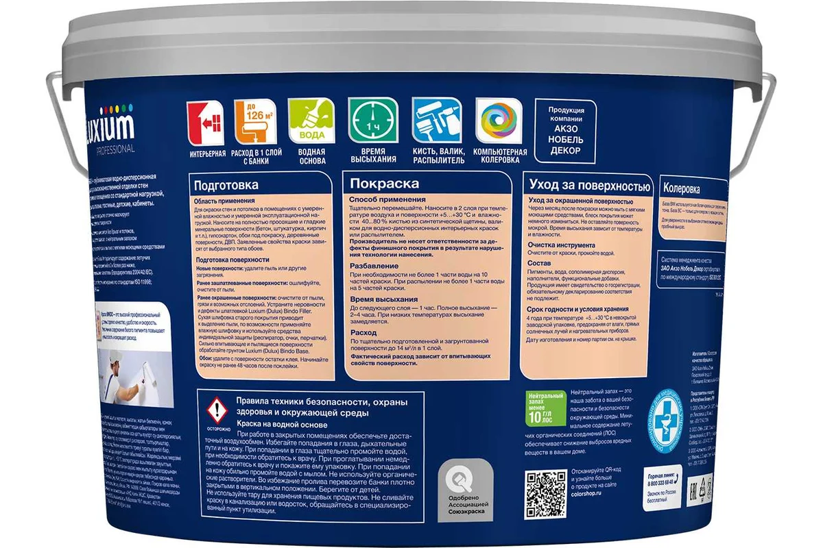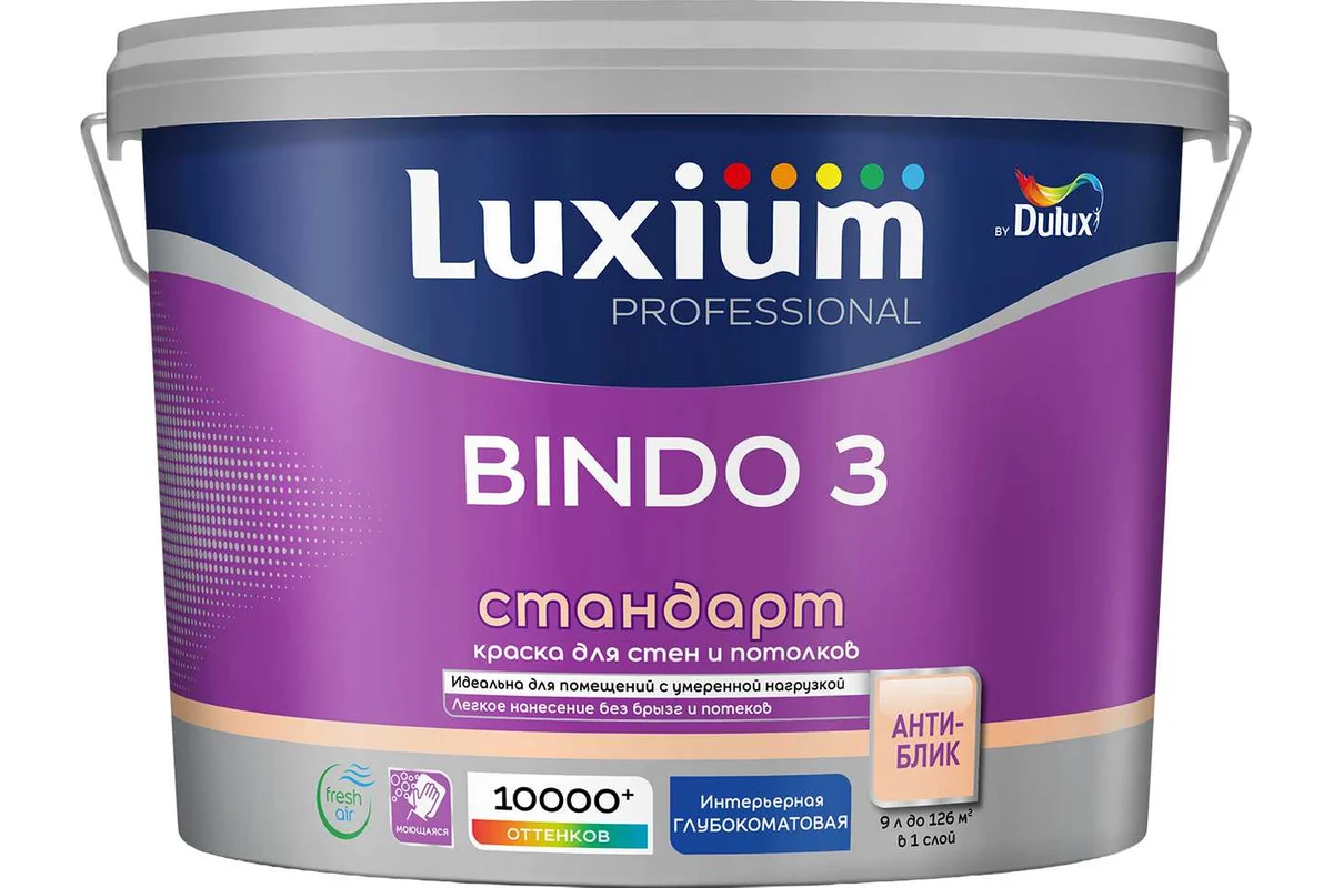 Краска Luxium by Dulux Professional Bindo 3 глубокоматовая BW 9 50034501 представляет собой акриловую водно-дисперсионную краску, подходящую для внутренних работ. Она обладает глубокоматовой степенью блеска, что обеспечивает равномерное покрытие и отсутствие бликов. Краска легко наносится с помощью кисти, валика или безвоздушного напыления, а также быстро сохнет, что позволяет ускорить процесс отделки. Белый цвет краски может быть заколерован, что дает возможность подобрать нужный оттенок для вашего интерьера. Продукт не имеет запаха и подходит для использования в детских и медицинских учреждениях, что подтверждается экологической сертификацией листок жизни. Краска устойчива к износу и моющаяся, что упрощает уход за окрашенными поверхностями. Она подходит для нанесения на различные основания, такие как кирпич, бетон и дерево, что делает ее универсальным решением для отделки стен и потолков.