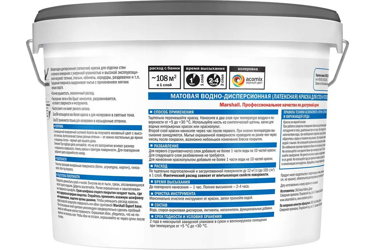 Краска MARSHALL EXPORT 7 (матовая; для внутренних работ; моющаяся; База BW; 9 л) 5248848 для стен и потолков. При нанесении образует покрытие с высокими декоративными свойствами и отличной адгезией. Подчеркивает рельеф поверхности. Окрашенная поверхность выдерживает мытье с применением мягких моющих средств. Краска легко наносится и быстро высыхает.