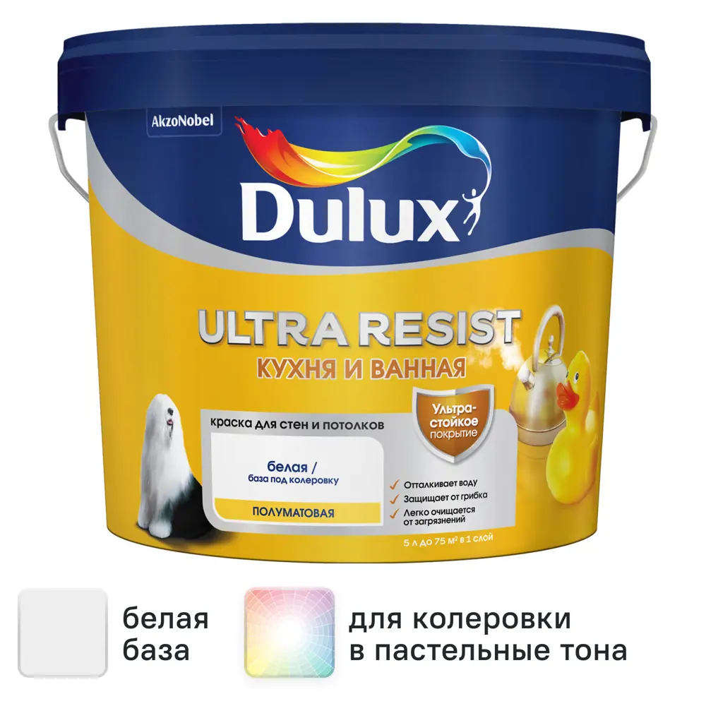 Dulux Ultra Resist - краска для кухни и ванной. Ультрастойкая водно-дисперсионная краска выдерживает воздействие пара, защищает поверхность от появления грибка и водорослей. Благодаря содержанию воска в составе создает ""эффект лотоса"" на окрашенной поверхности - покрытие отталкивает влагу и защищает от пятен. Образует особо прочное полуматовое покрытие, которое легко моется от загрязнений с использованием чистящих средств. Новая, исключительно износостойкая краска Dulux Ultra Resist Кухня и Ванная - это 7-ми кратный запас прочности покрытия ваших стен. Краска легко наносится без разбрызгивания и потеков, хорошо разравнивается, почти не пахнет. Товар сертифицирован для применения в детских и лечебно-профилактических учреждений. Подходит для нанесения на полностью просохшие минеральные поверхности (бетон, штукатурку, кирпич и т. п.), гипсокартон, обои под покраску, дерево, ДВП. Предназначена для внутренних работ - рекомендуется для окраски помещений с повышенной влажностью, таких как кухни, душевые, ванные комнаты, прачечные, санузлы и т. п.