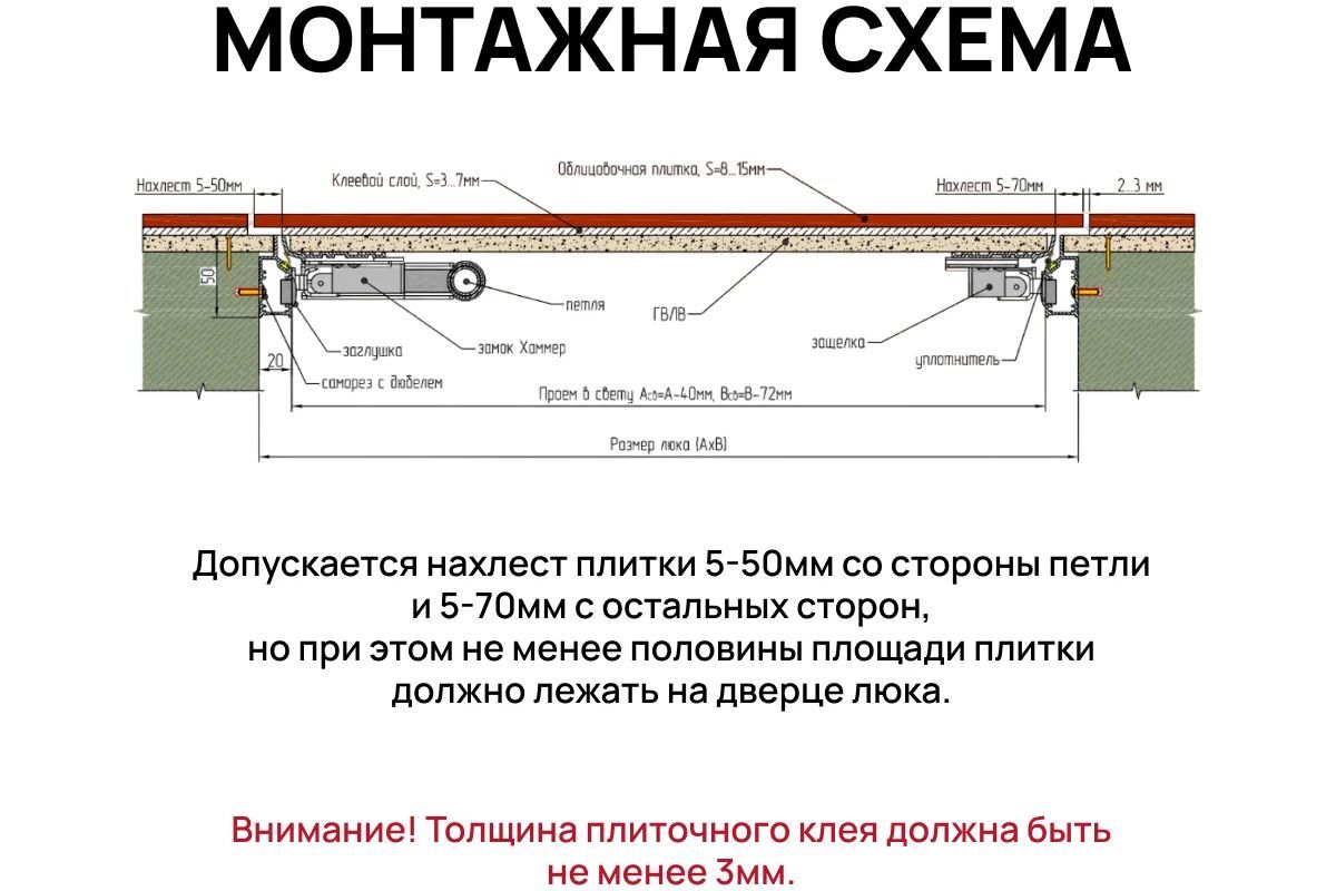 Монтаж изделия прост и не требует подрезки плитки в зоне люка, т.к. имеется возможность оклеивания дверцы отделочным материалом внахлест.