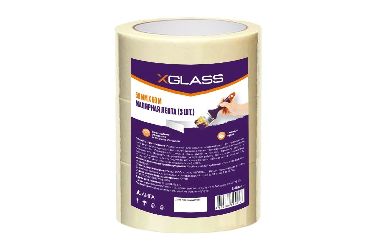Малярная клейкая лента XGLASS 50 мм, 50 м — это универсальный строительный материал, который широко используется в различных областях. Она применяется для защиты поверхностей при проведении малярных, штукатурных и других работ, где требуется получить ровные линии.