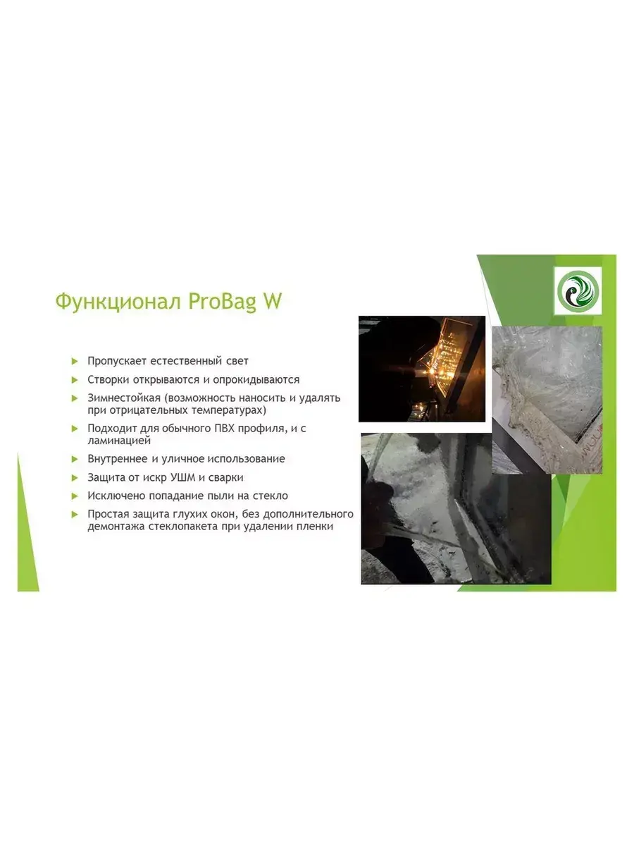 Нанести «ProBag W» валиком или кистью, на любую непористую поверхность. Рекомендованный расход от 100 до 150 г на 1 м2 поверхности. Валик погружать в ведро с жидкой пленкой, наносить на стекло ровным слоем. Оптимальный температурный диапазон для нанесения пленки ProBag W составляет от -20 до 20ºС.