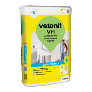Цементная влагостойкая шпаклевка. Подходит для финишного выравнивания стен и потолков перед оклейкой обоями или покраской, как в помещениях, так и для наружного применения. Имеет снежно-белый цвет, является влагостойкой и высокопрочной, поэтому может использоваться в ванных комнатах, кухнях, жилых помещениях. Экономна в расходовании.