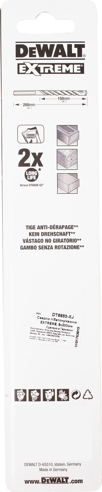 Сверло по бетону DeWALT Extreme DT6683-XJ 8 x 200 мм - это высококачественный инструмент от известного бренда DeWALT, который зарекомендовал себя на рынке как производитель надежных и долговечных инструментов.
