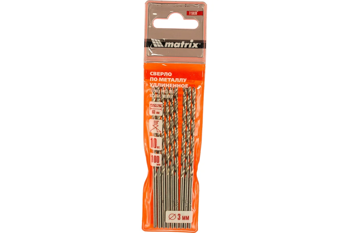 Полированное удлиненное сверло по металлу Matrix 715030 размером 3,0 х 100 мм, из стали HSS, с цилиндрическим хвостовиком, 10 шт. в упаковке, благодаря удлиненному профилю подходит для глубокого сверления. Угол заточки сверл составляет 118° и является оптимальным для работы с черными металлами, сталью, чугуном и твердой бронзой.