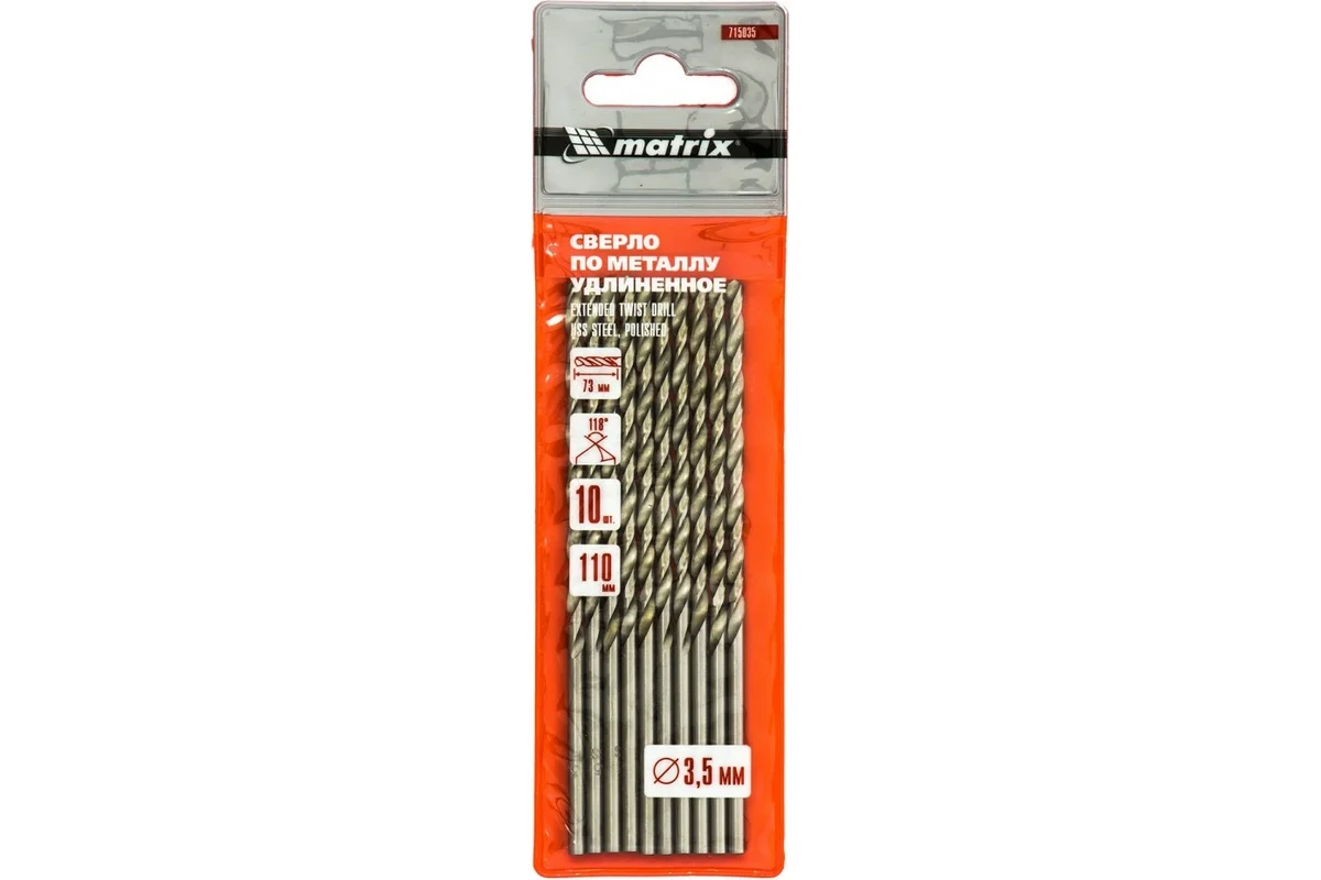 Полированное удлиненное сверло по металлу Matrix 715035 размером 3,5 х 110 мм, из стали HSS, с цилиндрическим хвостовиком, 10 шт. в упаковке, благодаря удлиненному профилю подходит для глубокого сверления. Угол заточки сверл составляет 118° и является оптимальным для работы с черными металлами, сталью, чугуном и твердой бронзой.